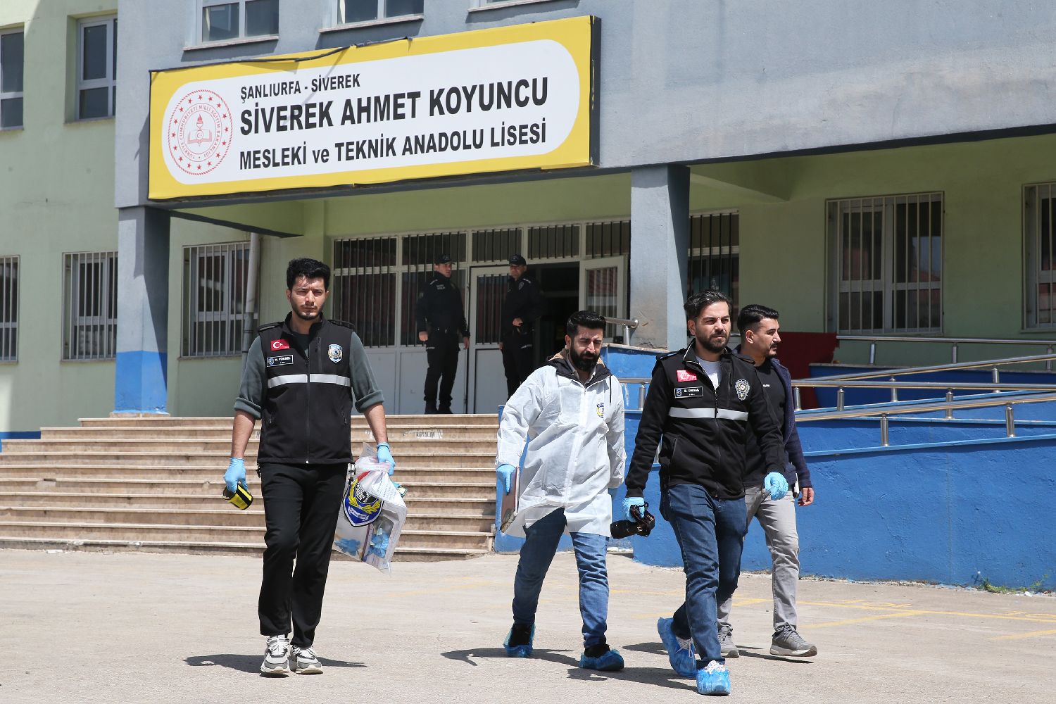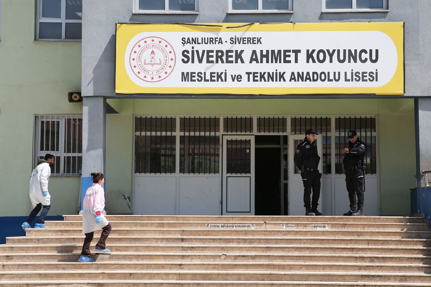 4月14日,在土耳其东南部尚勒乌尔法省的一所中学,警方派出的技术人员对枪击事件现场进行勘查。