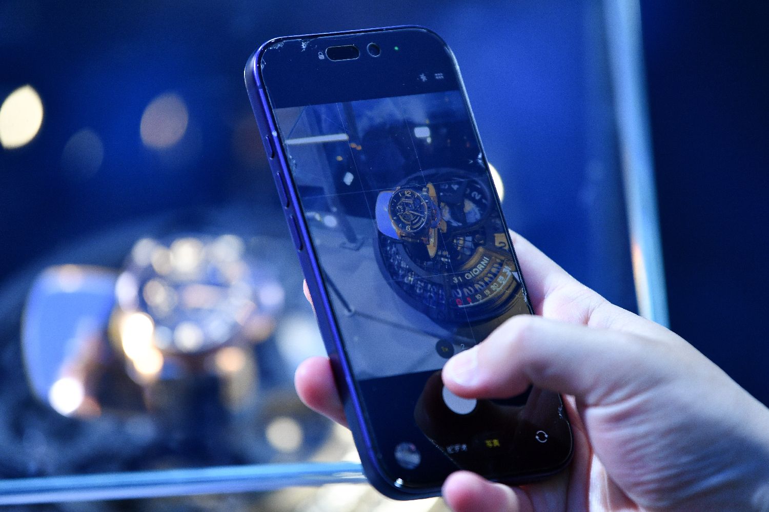 4月14日,在瑞士日内瓦举行的“钟表与奇迹”高级钟表展上,参观者拍摄展品。