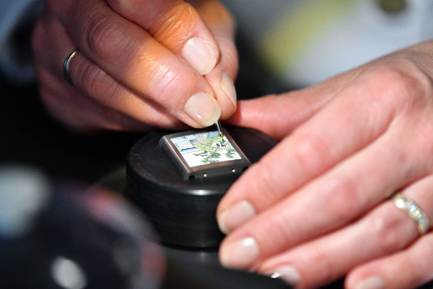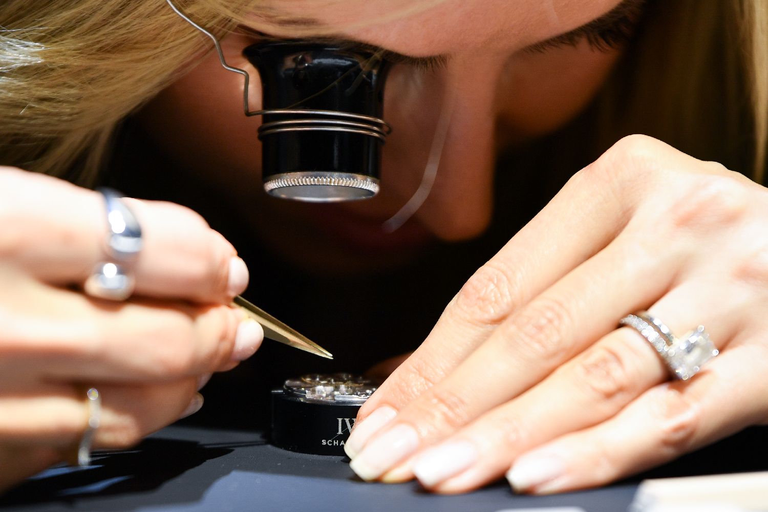 4月14日,在瑞士日内瓦举行的“钟表与奇迹”高级钟表展上,工匠展示钟表修复工艺。