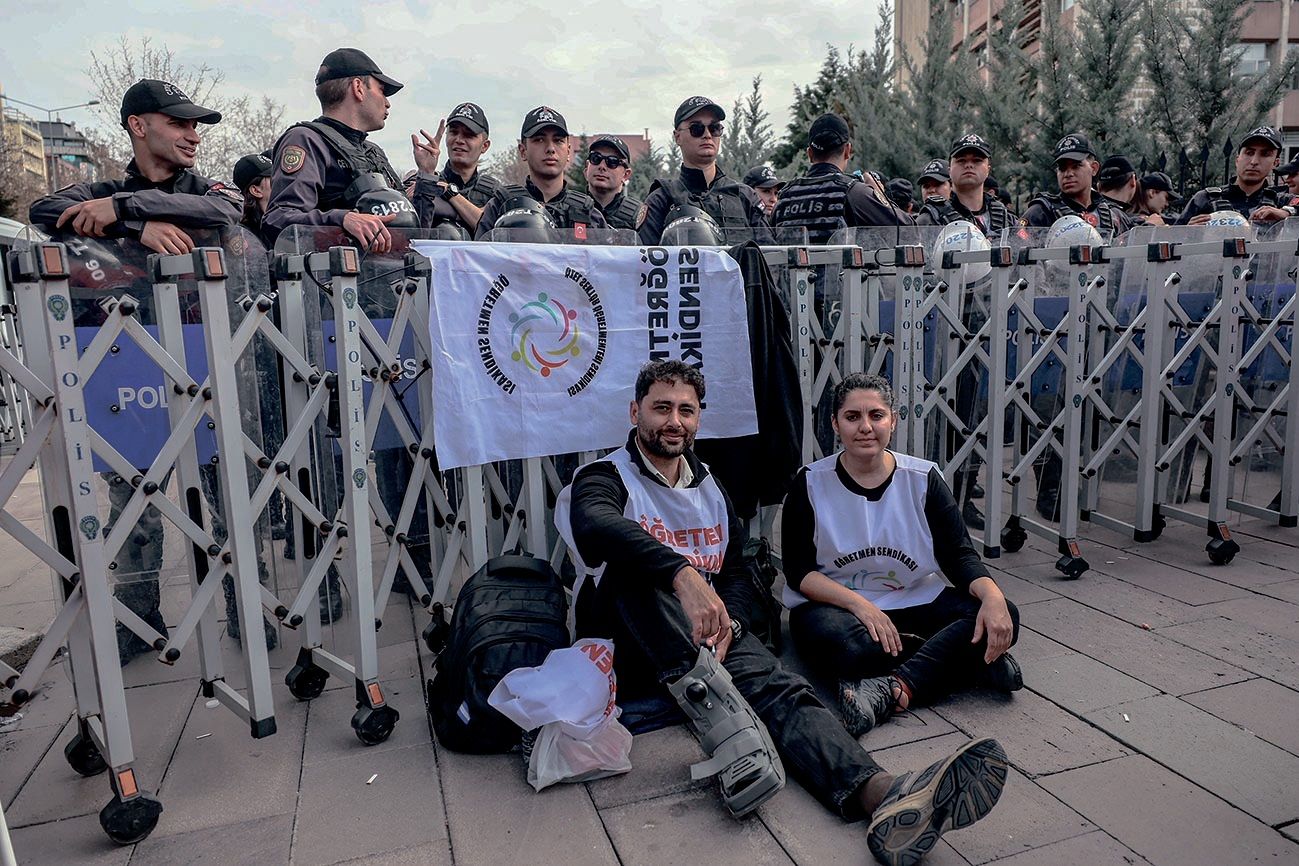 15日当天,土耳其教育工会前往位于安卡拉的教育部示威,抗议管理不力导致校园枪击事件。图为抗议者在教育部门前休息。法新社图