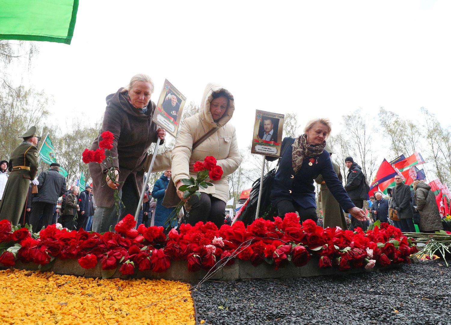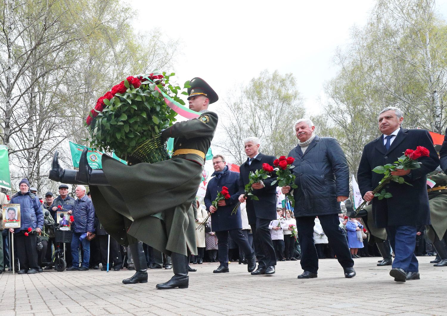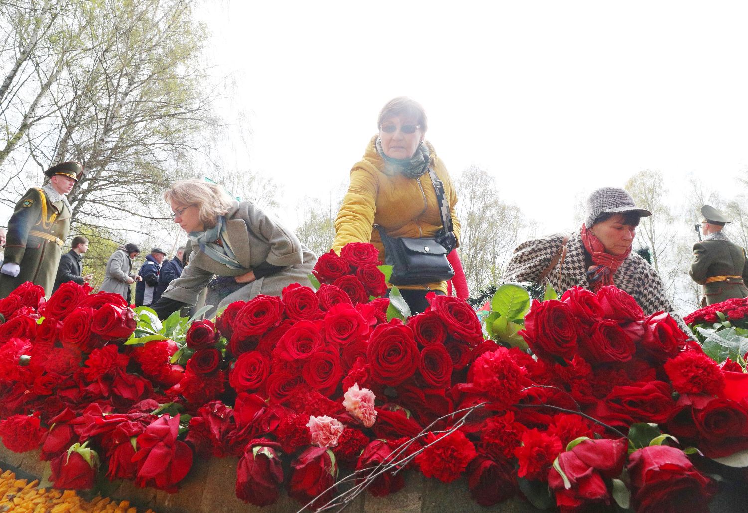 4月26日,在白俄罗斯明斯克,军人向切尔诺贝利遇难者纪念碑敬献花圈。