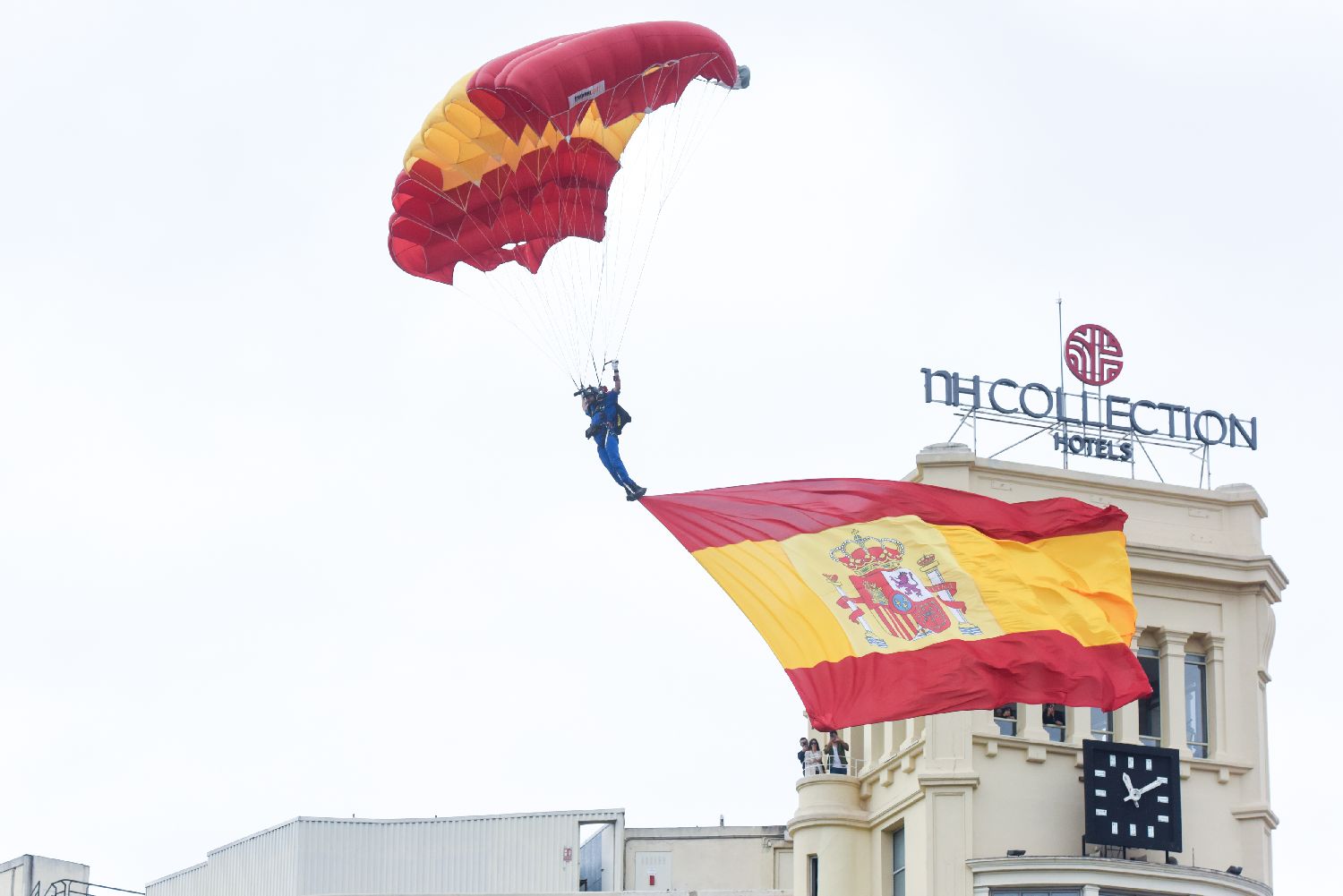 10月12日,在西班牙马德里举行的国庆阅兵式上,一名伞兵携带西班牙国旗从天而降。(图片来源:本文图片均据新华社)