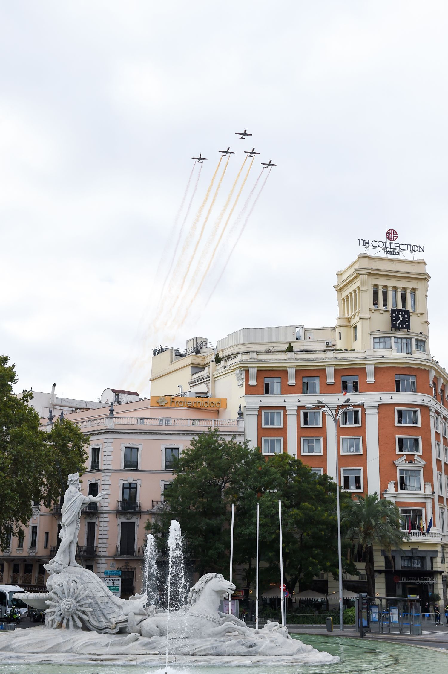 10月12日,在西班牙马德里举行的国庆阅兵式上,飞机喷射出象征西班牙国旗的红黄色烟雾。