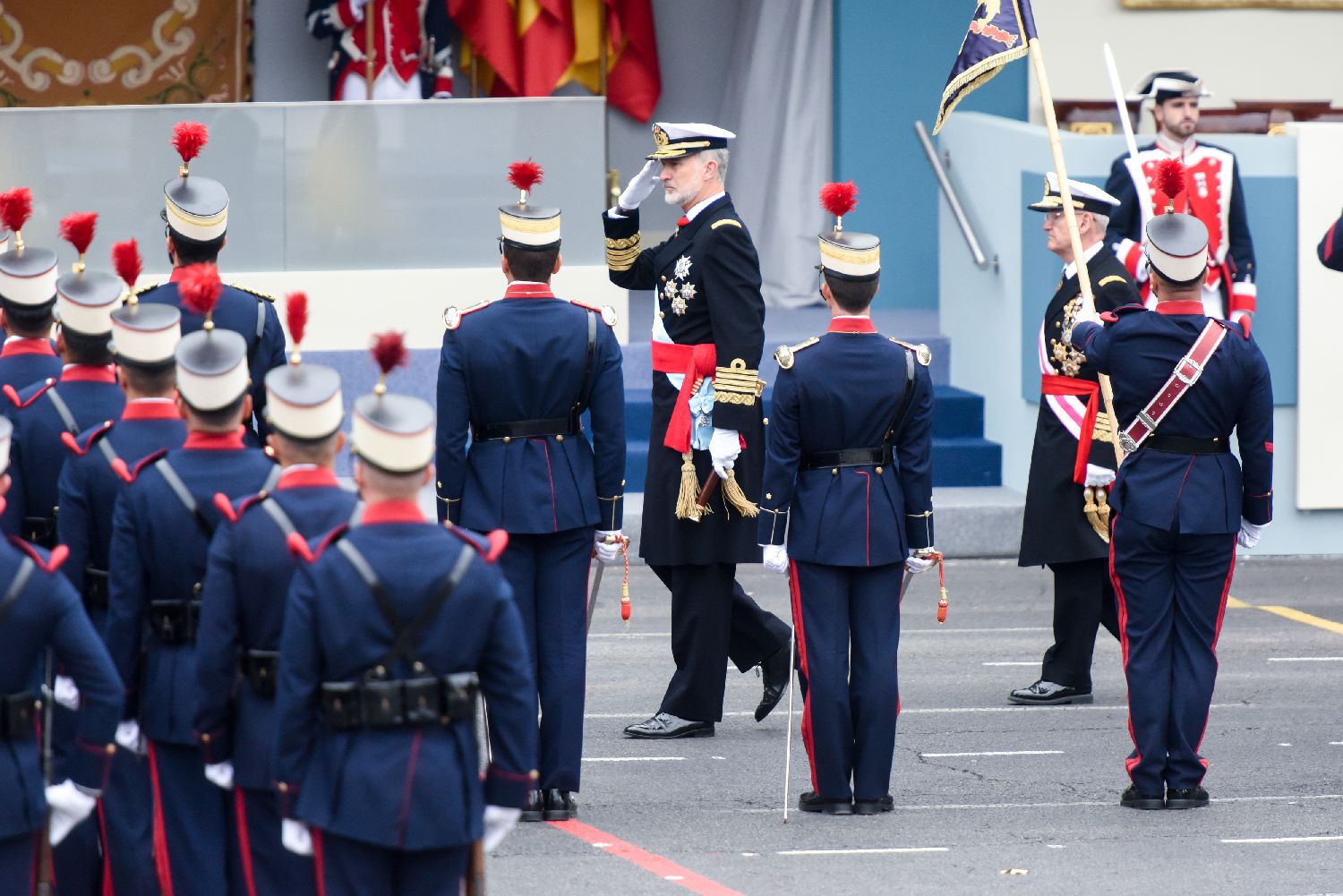 10月12日,在西班牙马德里,西班牙国王费利佩六世(中)在国庆阅兵式上检阅部队。
