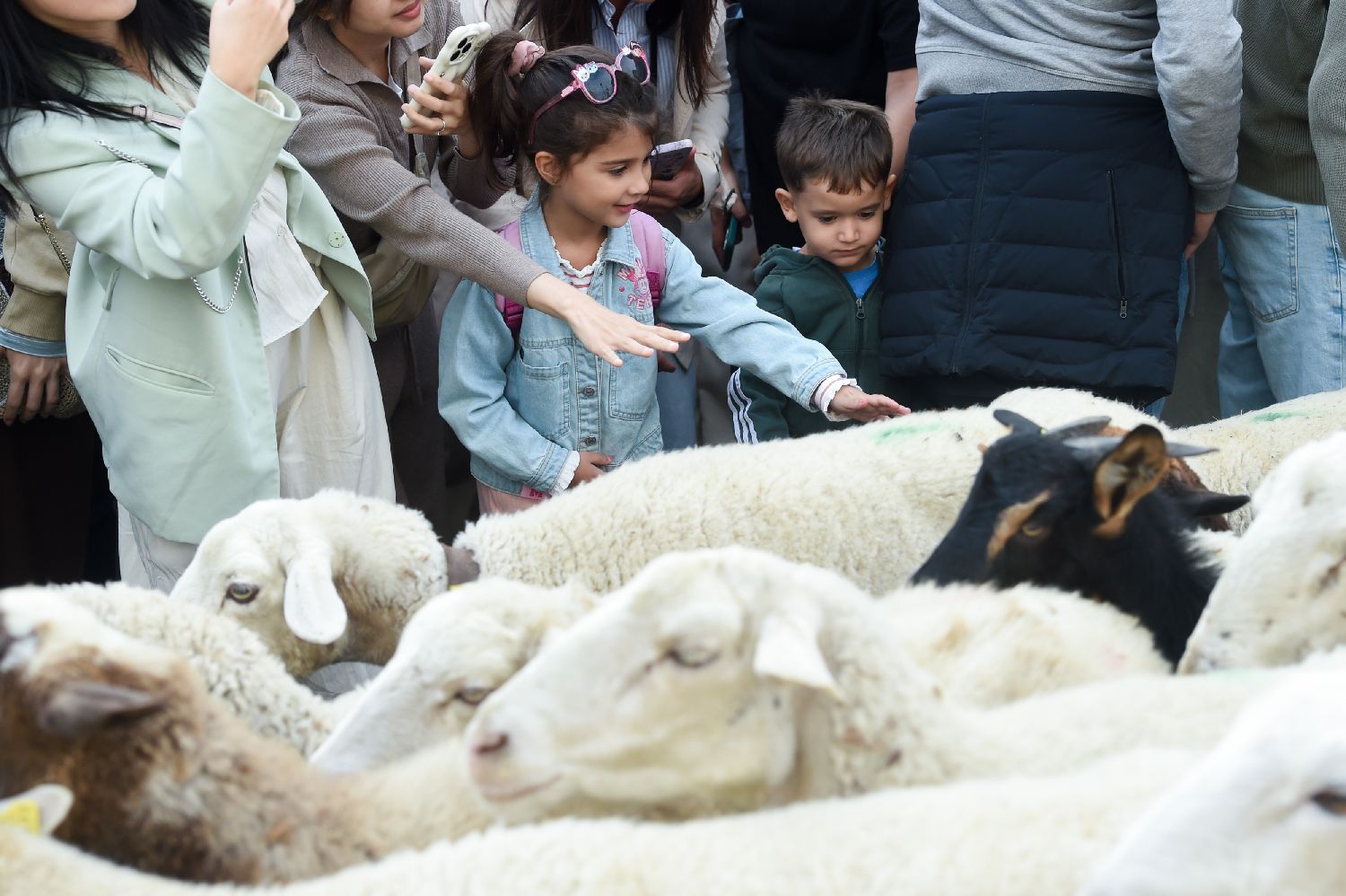 10月19日,在西班牙马德里,市民和游客观看移牧节上的羊。