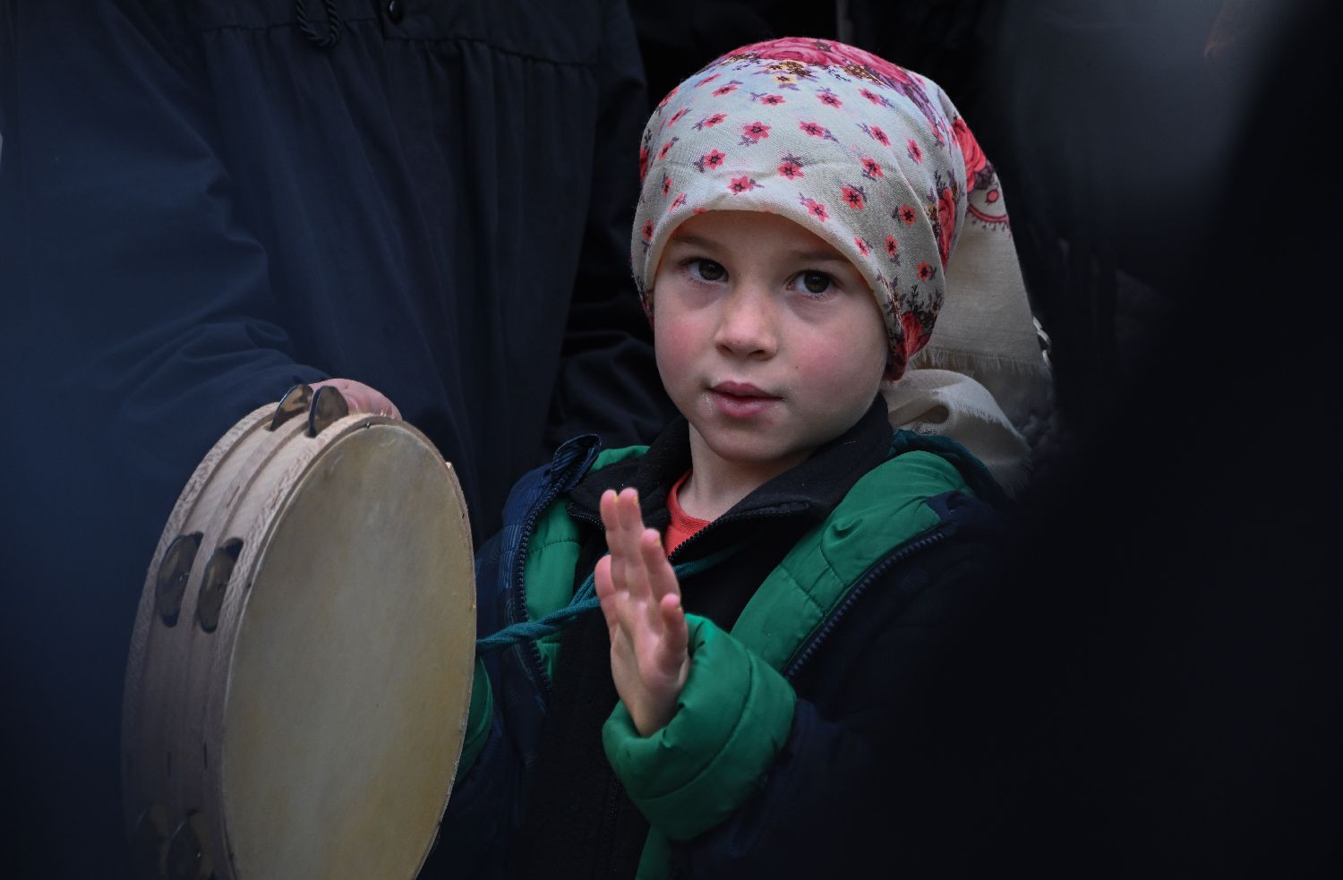12月14日,在西班牙首都马德里,小朋友在音乐巡游中演奏传统打击乐器。