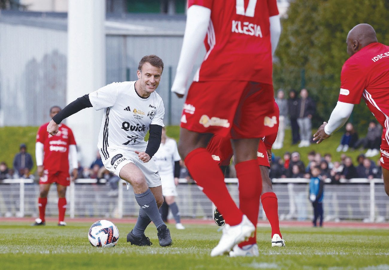 马克龙身穿3号白色球衣,率领“总统队”球员:法国足球运动员布兰科(Laurent Blanc)、法国国家男子足球队主教练德尚(Didier Deschamps)、前法国足坛巨星皮雷斯(Robert Pirès)以及德塞利(Marcel Desailly)上场踢球。