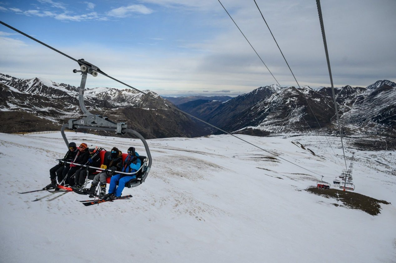 当地时间2024年1月3日,法国比利牛斯-东比利牛斯省,滑雪者在波特-普莫伦斯滑雪场乘坐缆车。(图片来源:CFP)