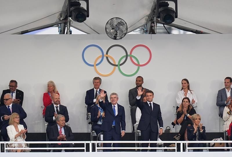 26日,国际奥委会主席巴赫(前排左三)和法国总统马克龙(前排左四)出席开幕式。(图片来源:新华社)