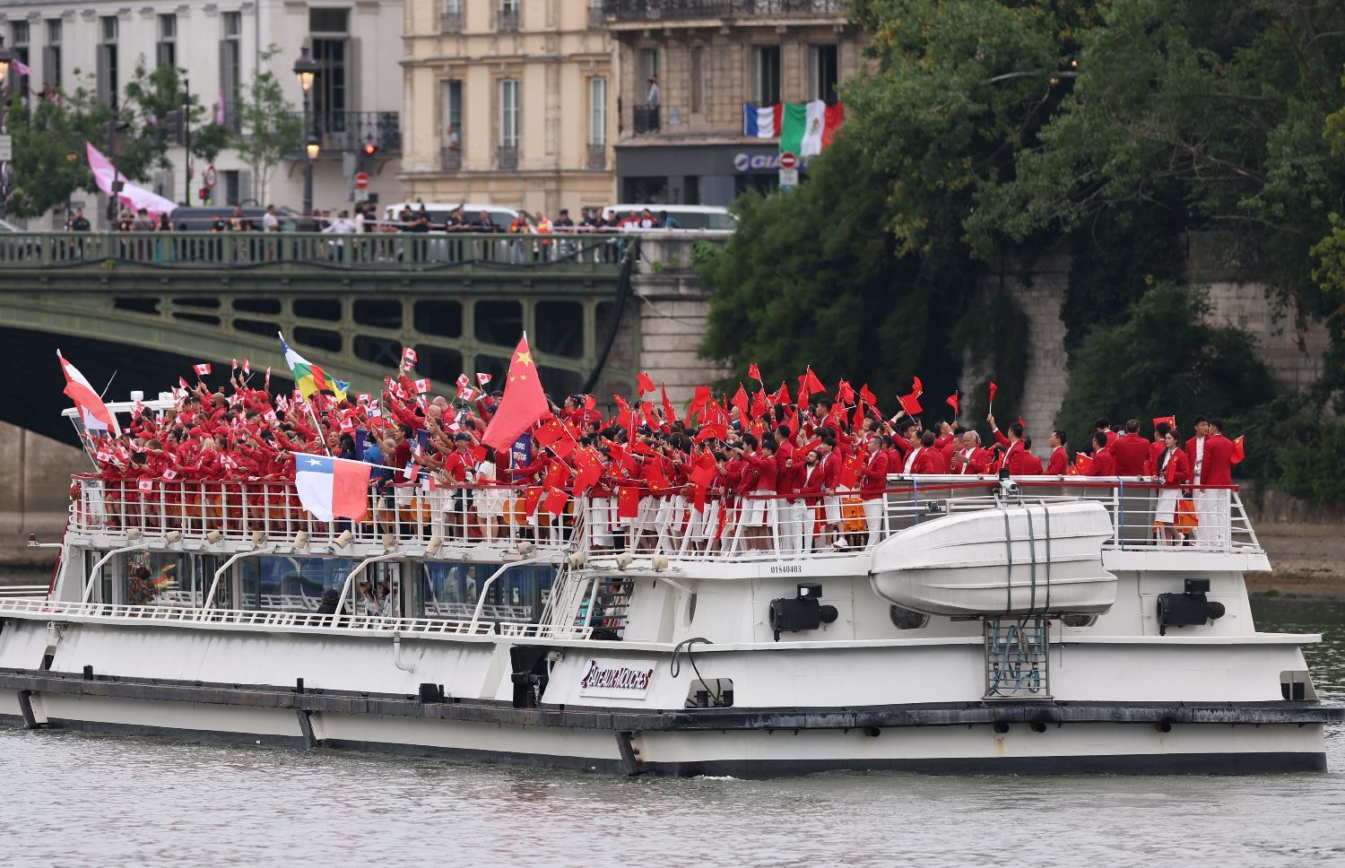 在开幕式上,中国乒乓球运动员马龙、花样游泳运动员冯雨高擎五星红旗,中国体育代表团运动员乘坐的游船在塞纳河巡游。