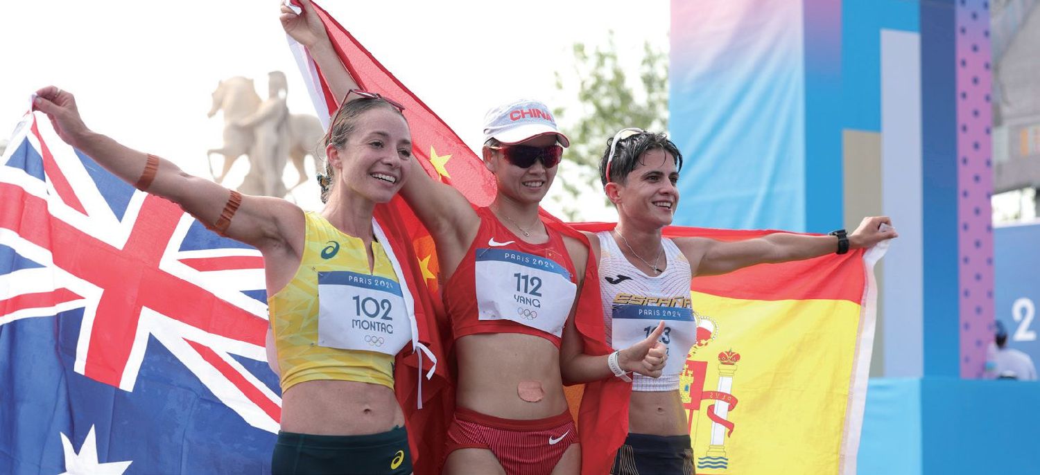 当地时间8月1日,在巴黎奥运会田径女子20公里竞走决赛中,中国队选手杨家玉(中)以1小时25分54秒的成绩夺冠,西班牙队选手佩雷斯(右)获得亚军。(图片来源:中新社)