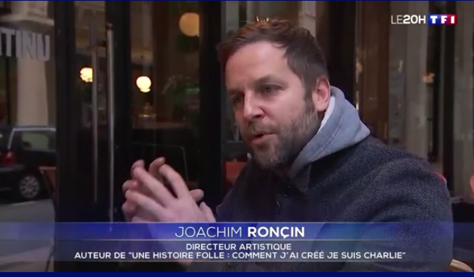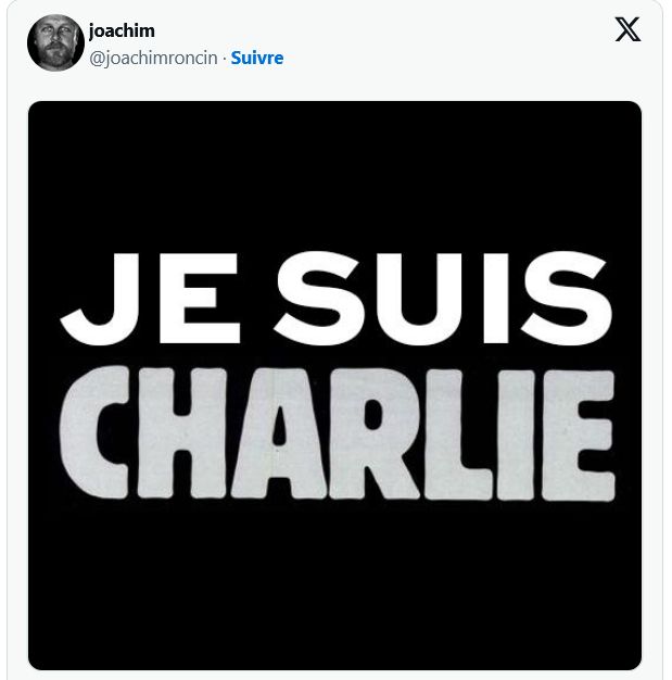 库阿奇(Kouachi)兄弟袭击事件发生后仅一小时,即上午11时30分,约阿希姆在Twitter(X网络的前身)上发布了一张图片,在黑色背景上写着“我是查理”。“这是一个非常纯粹的信息,比‘我是查理周刊’更宽泛一些,”约阿希姆对着镜头说:“我确实是在通过这三个词捍卫言论自由。我不一定是在捍卫编辑方针,我是在捍卫不能因为漫画而杀人这个事实。”