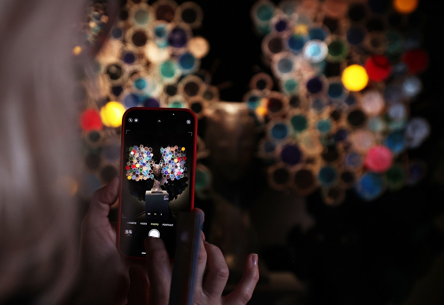 4月6日,一名女子在法国巴黎大皇宫举行的2025年巴黎艺术博览会上为艺术品拍照。