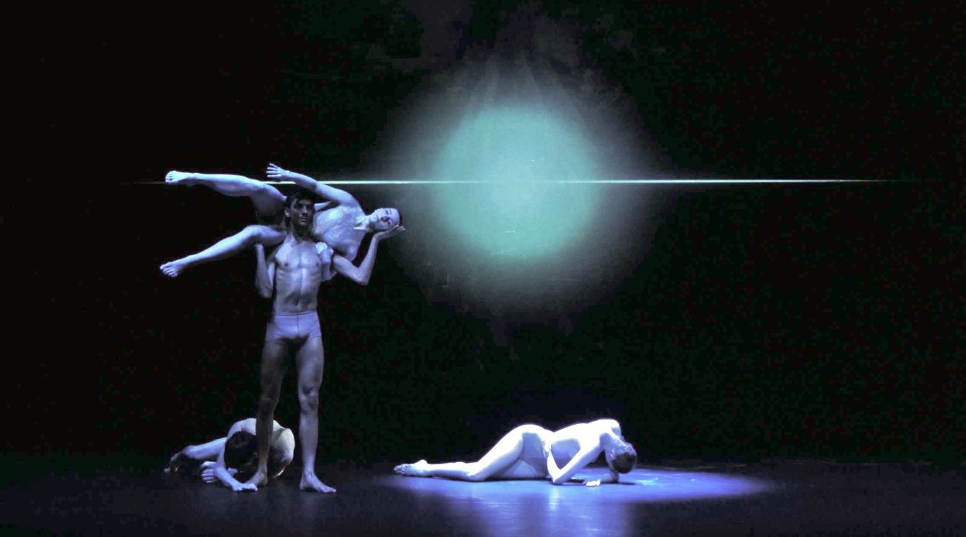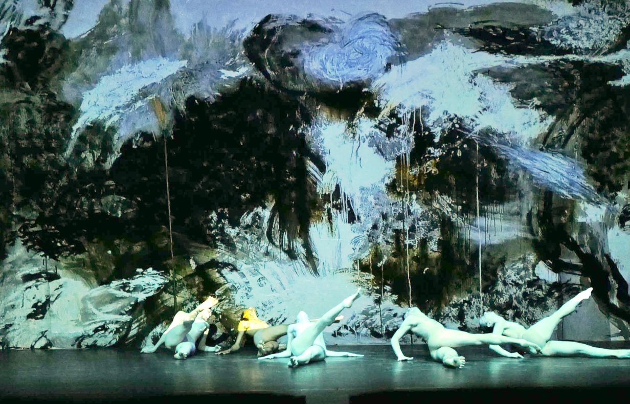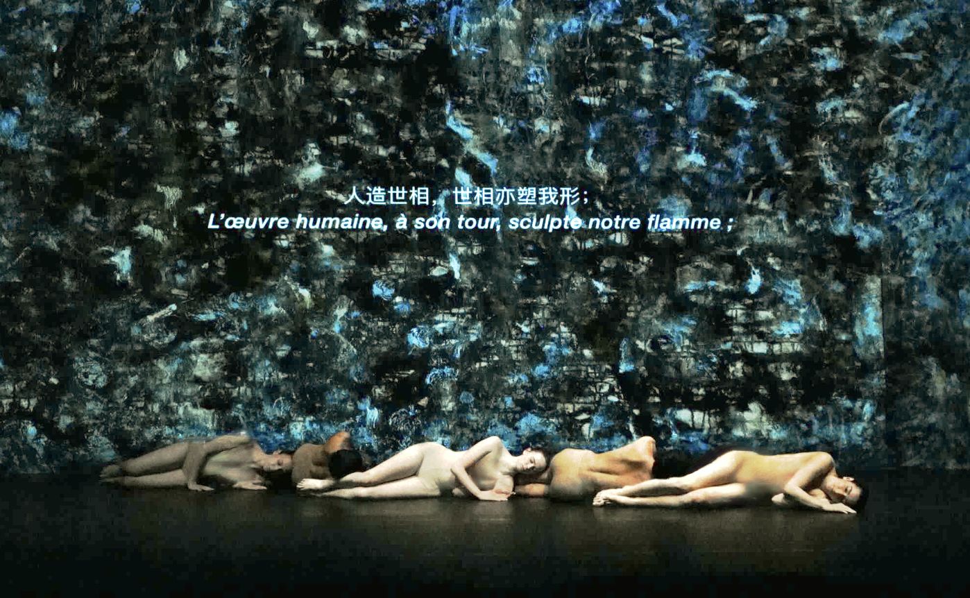 在表演中沈伟并不拘泥于舞蹈本身。他以编舞家、视觉艺术家、诗人、画家等多重身份,将绘画、摄影、音乐、装置、影像与诗意文字编织成整体的艺术语言,创造出一个既遥远又亲密、既朦胧又具象的舞台空间。舞者的身体宛如浮屠中的浮雕,在昏暗光影中翻卷、起伏,穿梭于记忆与幻象之间,沟通舞台上下,古今中西。这种舞台美学所体现的,不仅是对空间的掌控,更是一种东方哲思的具化:虚实相生,留白与紧密之间暗含神韵。舞者时而静止如雕塑,时而若奔涌激流,动静相生,恰如《金刚经》中所云“应无所住而生其心”——不执于形,不固于法,却又在“无我相、人相、众生相、寿者相”中重建人与自然、人与历史、人与自身的关系。