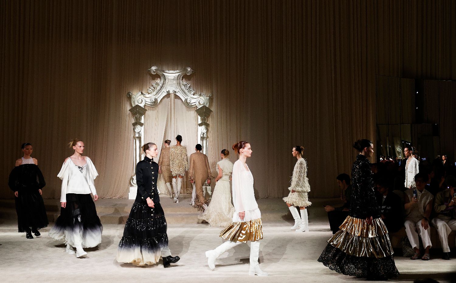 法国品牌香奈儿8日在巴黎大皇宫举行2025/2026秋冬高级定制服系列发布会,创新演绎经典秋冬装束,套装作品呈现乳白色、象牙色、棕色、绿色和黑色等自然色调,剪裁比例借鉴了男装设计理念,展示了充满田园气息、低调克制又精致考究的新品。