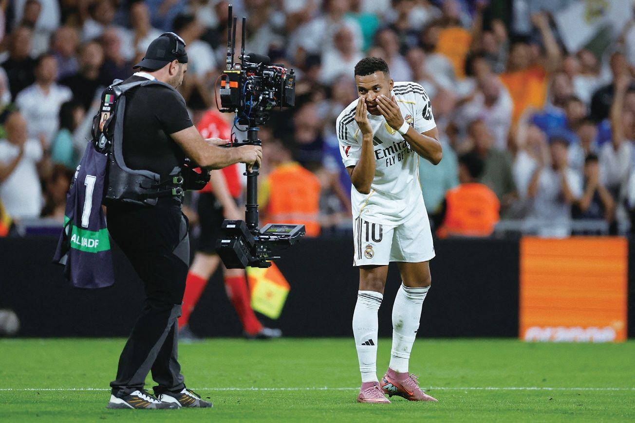 10月6日,法国国家足球队再次集训,备战对阵阿塞拜疆和冰岛的比赛。尽管4日在西班牙联赛中脚踝受伤,前锋姆巴佩仍将到国家队报到。图为他4日为皇家马德里队进球后庆祝。法新社图