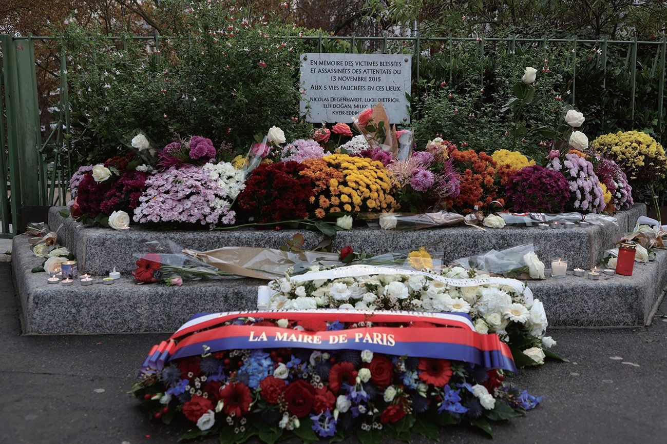 巴塔克兰剧院外,写有遇难者姓名的纪念牌下,摆满了鲜花。“今天,我允许自己回忆、流泪、释放情绪……但明天,生活仍将继续。”在袭击中失去丈夫的德国人索菲·布沙尔-施泰希说道,她每年都会来此悼念。