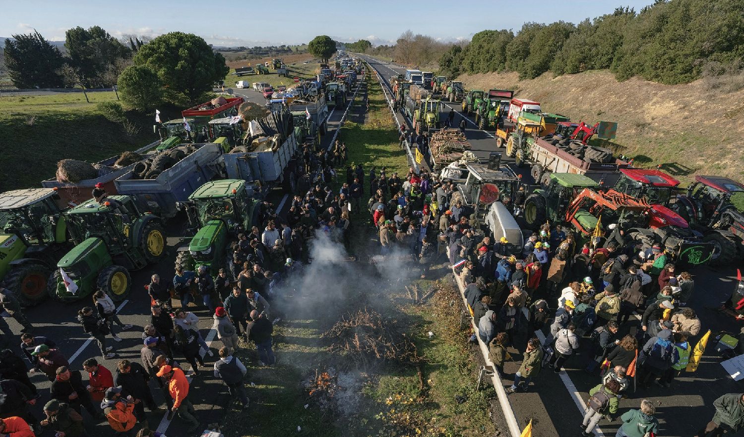 抗议现场,农村协调组织(CR)、农业经营者工会联合会(FNSEA)、青年农民协会(JA)等主要农会组织的旗帜飘扬,抗议者驾驶农用机械阻碍双向交通,并拆除公路中间的安全护栏,甚至在路上摆上烧烤架。