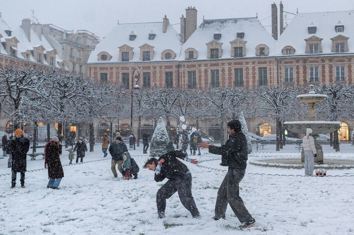 1月5日,巴黎普降大雪,年轻人在积雪覆盖的孚日广场上打雪仗。法新社图