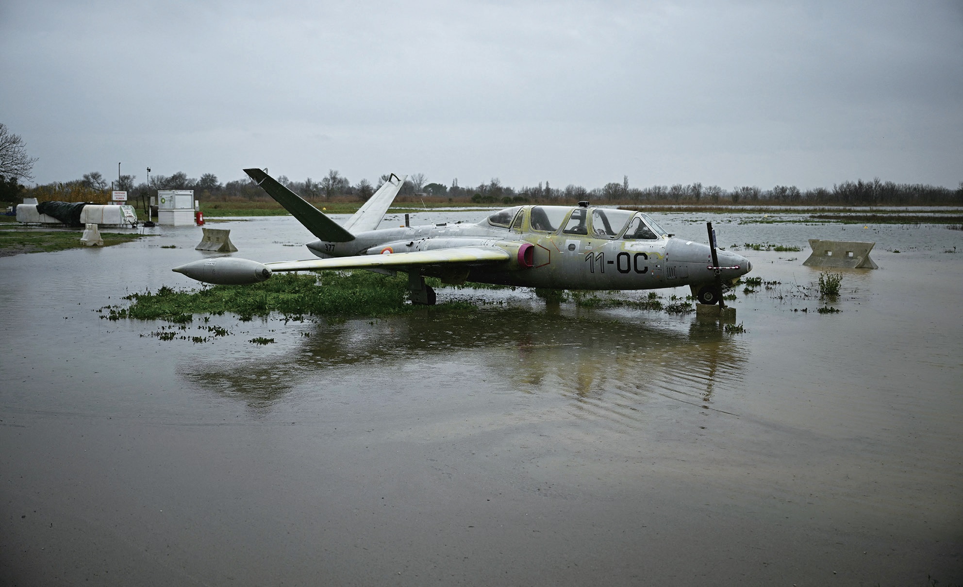19日,因为强降雨,法国南部奥德省、南科西嘉省、上科西嘉省、埃罗省和东比利牛斯省5省拉响橙色暴雨及洪水警报。图为奥德河河水泛滥,一架法国巡逻兵飞行表演队退役的Fouga Magister CM-170飞机停放在纳博讷附近被洪水淹没的田野中。法新社图