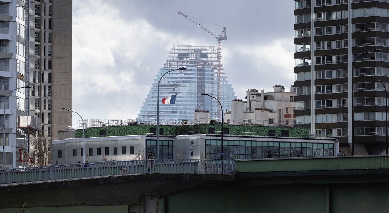 图为3月12日,位于巴黎西南部凡尔赛门展览中心区域的巴黎“三角塔”(Tour Triangle)在争议声中拔地而起,轮廓初现天际。180米高、42层的“三角塔”将成为巴黎第三高建筑,仅次于埃菲尔铁塔和蒙巴纳斯大厦。法新社图