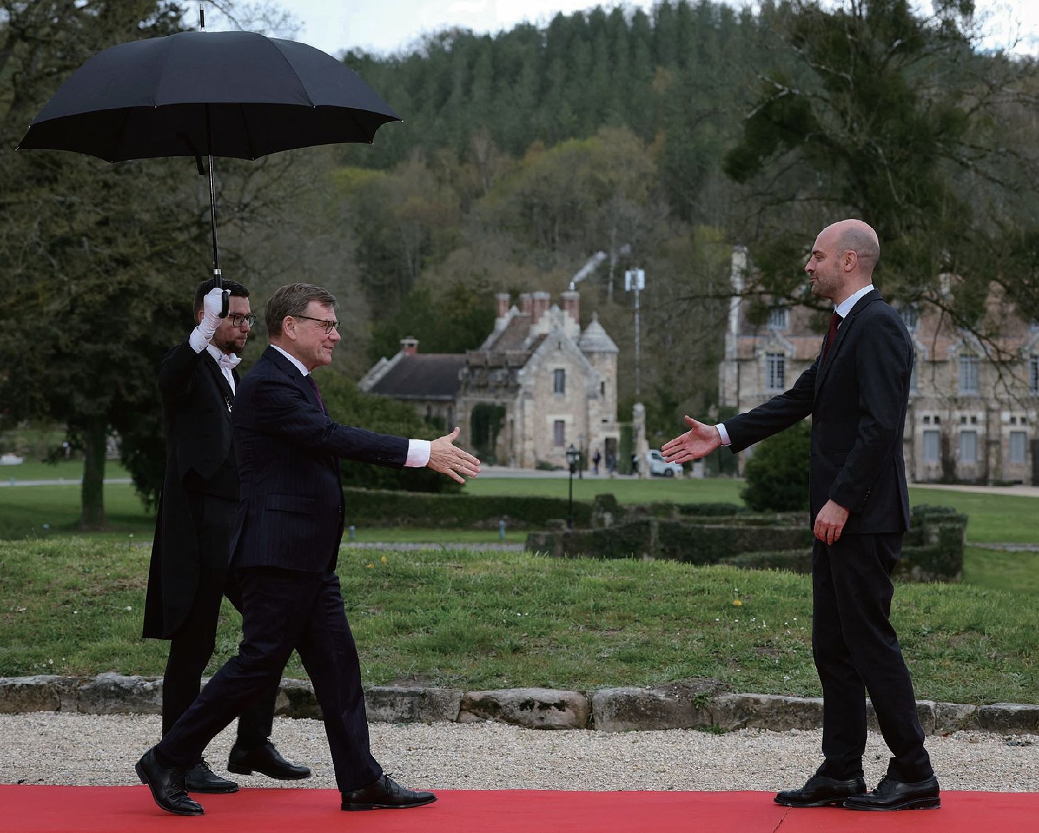 图为法国外长巴罗在会场外迎接德国外长瓦德富尔。法新社图