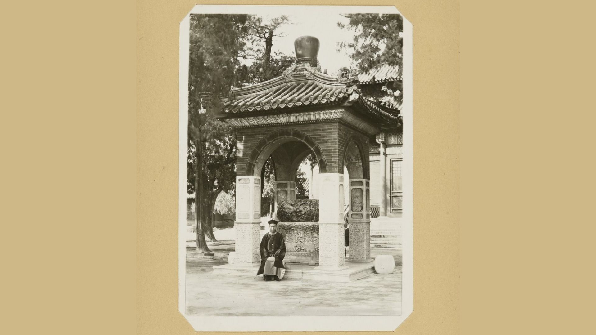 En 1745, l’empereur Qianlong disposa une vasque à vin en jade et son socle en pierre sous un kiosque couvert de tuiles bleues. Aujourd’hui, malgré les reflets sur la vitre de protection, on peut encore admirer la frise d’animaux et chimères sculptés en relief. Cette vasque fut sculptée en 1265 pour Kubilaï Khan, le fondateur de la dynastie Yuan, qui l’avait placée sur l’île du lac Beihai. Elle fut enlevée en 1579, sous la dynastie Ming, à l’occasion d’une réfection des constructions de l’île. Puis elle se trouva entreposée dans un temple où elle servit de bac à saumure. L’objet échappa aux pillages lors de l’occupation de Pékin par les troupes de l’Alliance des huit nations en 1900.