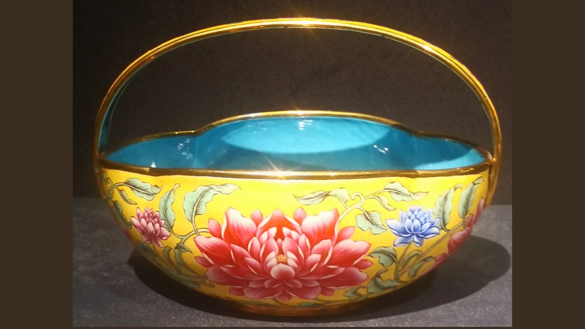 Il y a notamment deux théières en or émaillé, l’une avec des dessins de chrysanthèmes roses, blancs et bleus sur un fond jaune, l’autre avec des motifs floraux bleus sur un fond blanc, et qui sont respectivement indexées gu116545 et gu116597. Il y a aussi une coupe à pétales en or émaillé en bleu pour sa surface intérieure et avec des pivoines sur fond jaune à l’extérieur. Ces objets furent montrés lors d’une exposition croisée Cité interdite- Versailles en 2024 dans la salle Wenhuadian de la Cité interdite, et quelques publications éclairèrent leur origine.
