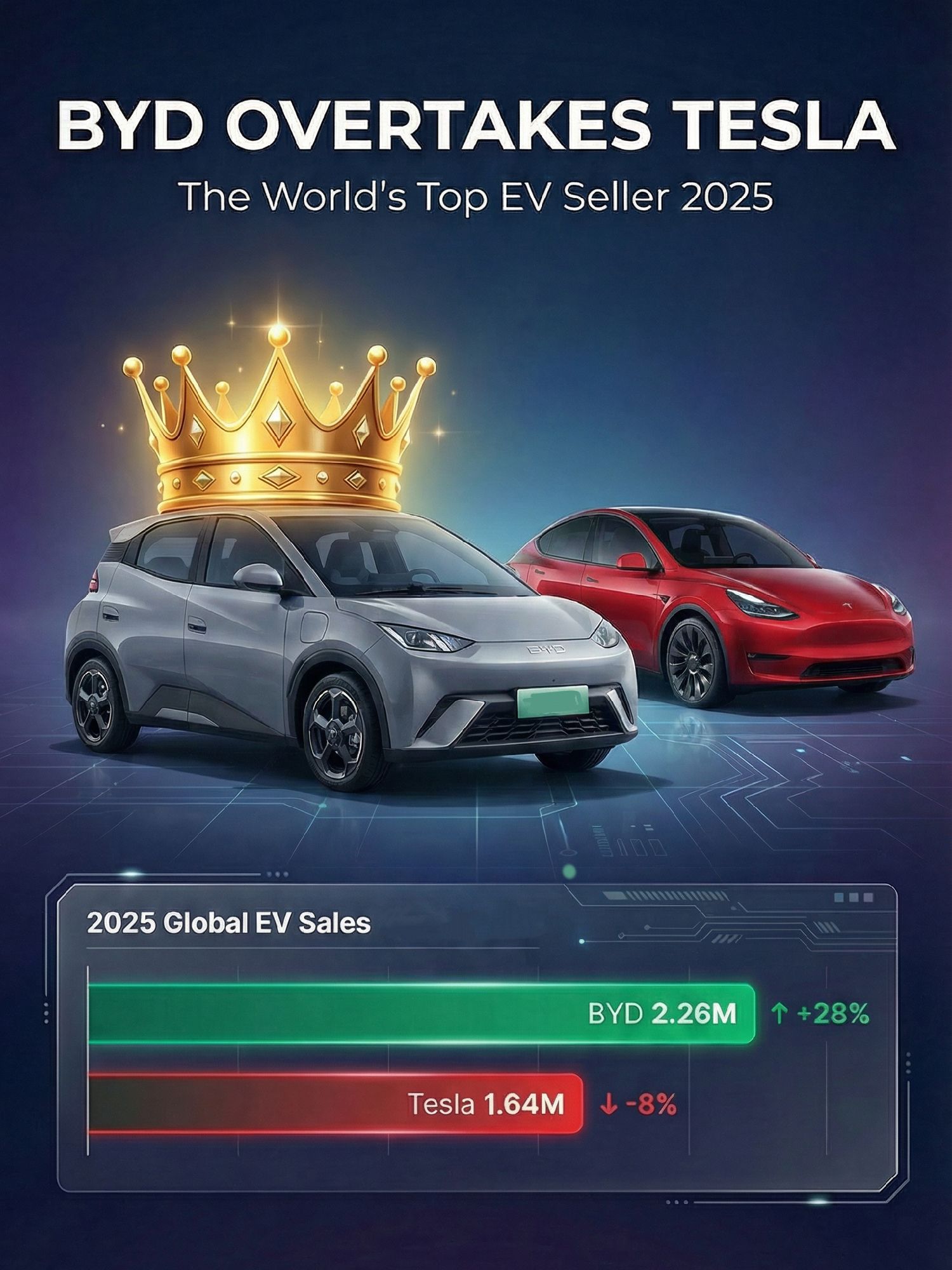 Das chinesische Unternehmen BYD lieferte im Jahr 2025 rund 2,26 Millionen Elektrofahrzeuge aus und überholte damit Tesla als weltweit führenden Verkäufer von E-Autos.