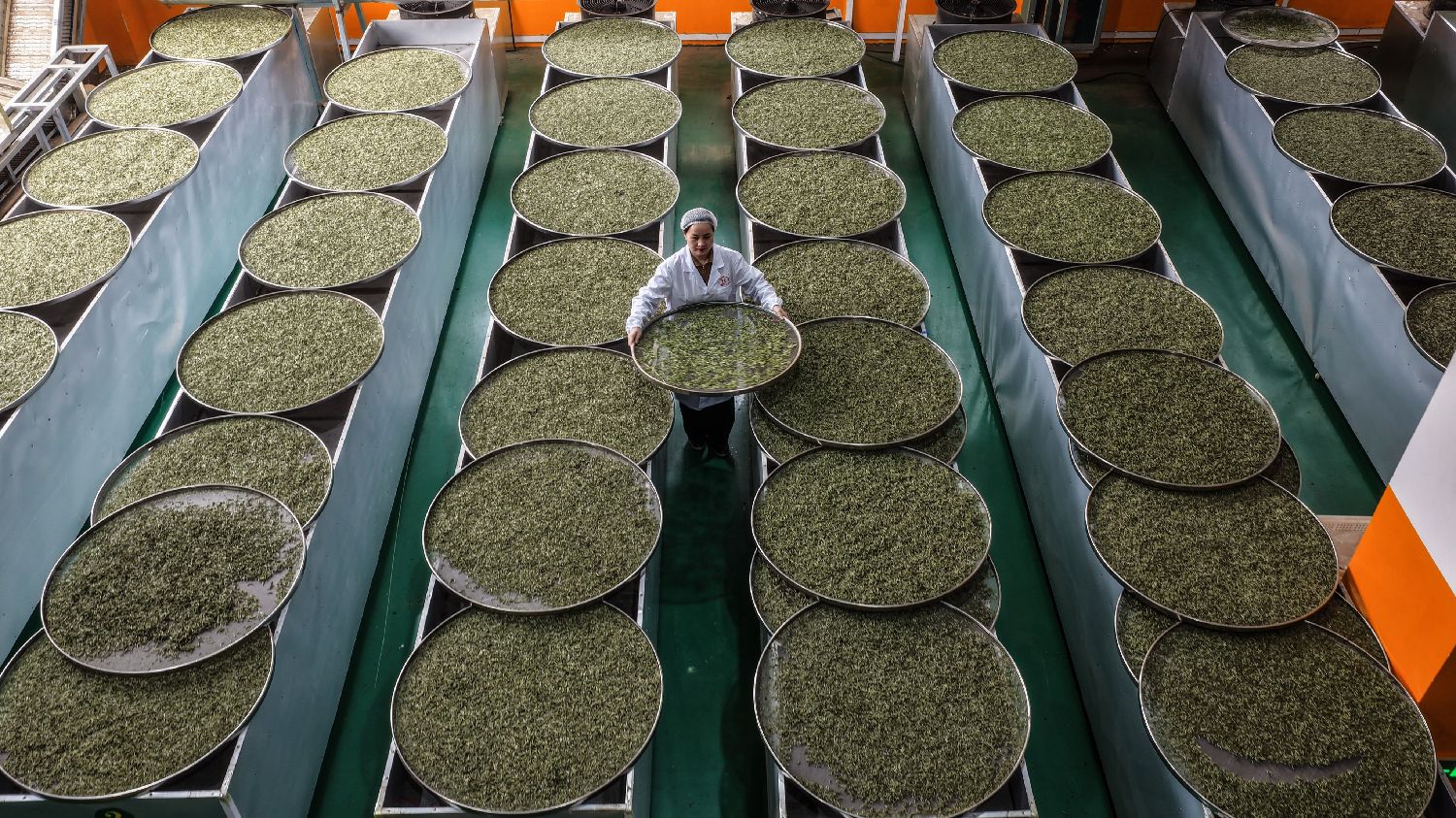 GUANGXI, 16. März 2026 (Xinhua) -- Die Luftaufnahme einer Drohne zeigt eine Angestellte bei der Verarbeitung von Schwarztee in einer Teefabrik im Autonomen Kreis Sanjiang der Dong im Autonomen Gebiet Guangxi der Zhuang-Nationalität in Südchina, 14. März 2026. Mit Beginn der Frühjahrs-Teeernte sind Teefabriken und Landwirte im Autonomen Kreis Sanjiang der Dong intensiv mit der Ernte von Teeblättern beschäftigt. (Xinhua/Zhang Ailin)