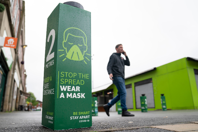 5月21日,一名男子走过英国英格兰北部博尔顿街头提醒人们佩戴口罩的防疫告示。英国卫生部20日发表声明说,鉴于印度报告的B.1.617.2变异新冠病毒在英国部分地区传播,英国正采取多项措施加强防疫,以阻止该变异病毒蔓延。(图片来源:新华社)