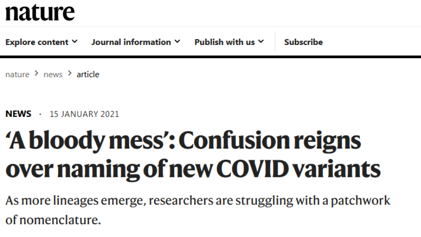 《自然》杂志在一篇报道中举了首次发现于英国的B.1.1.7变种病毒作为有代表性的例子。起初,该种病毒被英格兰卫生局命名为VUI202012/01(202012/01变体),后来经过风险评估,被升级为VOC202012/01(值得关注的202012/01变体),专业研究人员则更喜欢用Nextstrain(该项目从世界各地的研究团体收集基因数据,按照“地理位置”和“样本时间”两种维度进行划分,对病毒传播的时间和空间进行可视化)开发的序列命名法,称之为20I/501Y.V1;英国本土媒体报道时,这种病毒则被称为Kent variant(肯特变种),因为该病毒溯源后最早在肯特郡被发现;而到了德国,该变种病毒就直接被命名为“英国变种”……