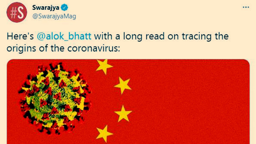 “中国病毒”“武汉肺炎”的称呼更是持续见诸印度媒体的报端。就在5月20日,印度媒体“Swarajya”还在网站与官方推特“SwarajyaMag”发文追寻新冠病毒起源时,配图使用中国国旗五星红旗,其中的大五角星被替换为病毒的图片,引发中国网民指责。