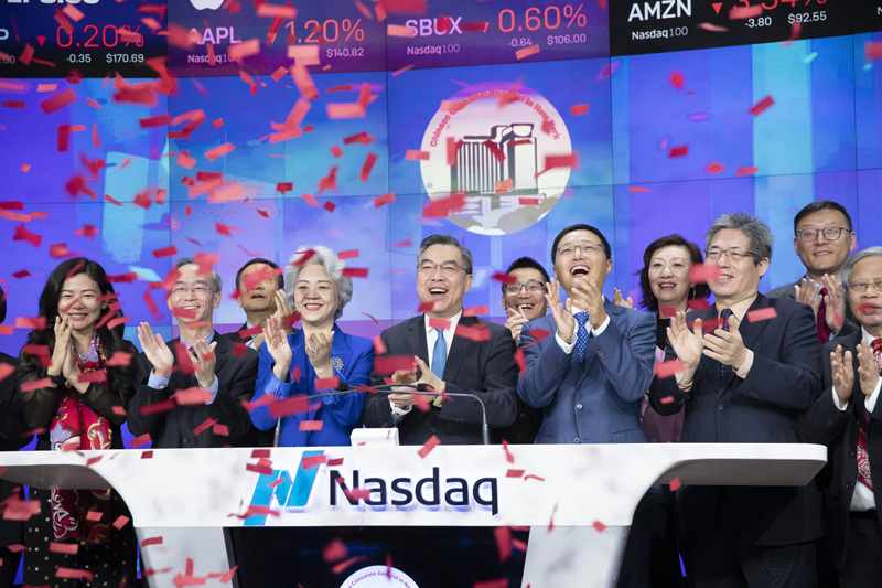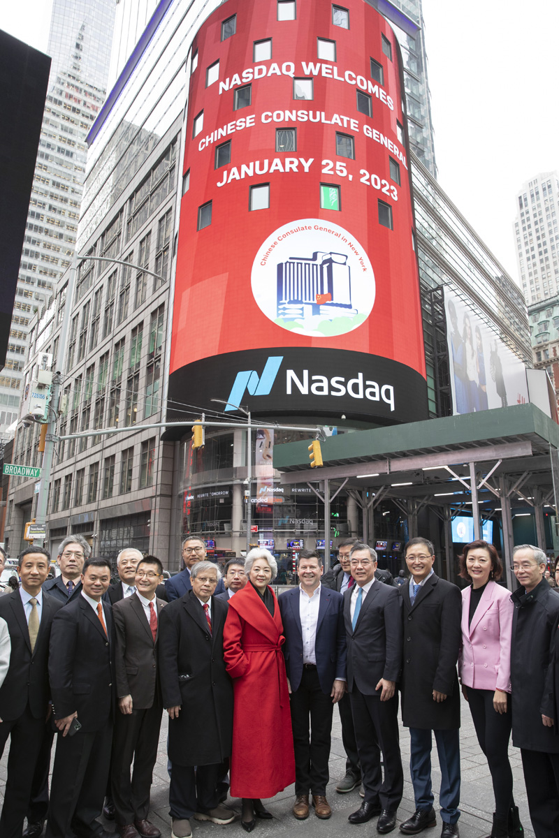 1月25日,中国驻纽约总领馆与纳斯达克集团在纽约纳斯达克证交所联合举办庆新春敲钟仪式。(图片来源:中新社)