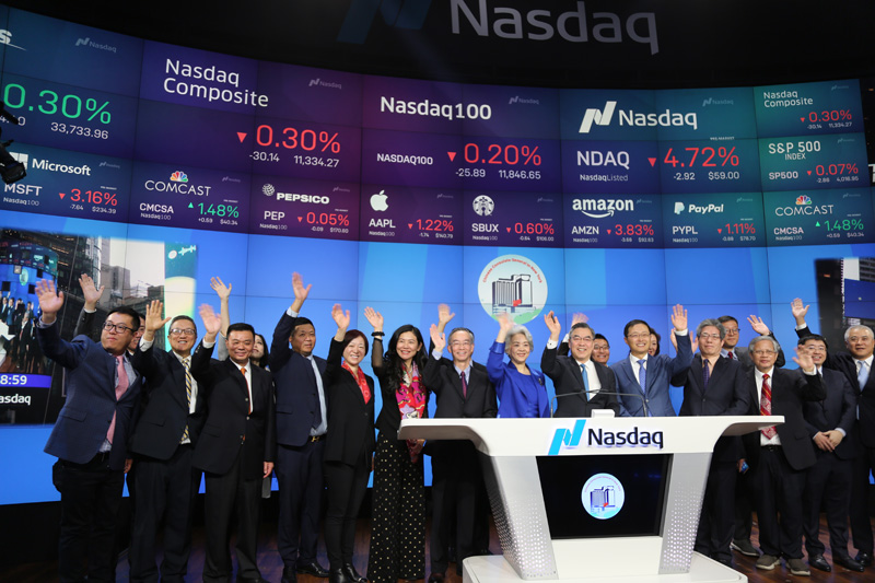 1月26日,中国驻纽约总领事黄屏(右九)等在美国纳斯达克交易所参加敲钟仪式。(图片来源:新华社)
