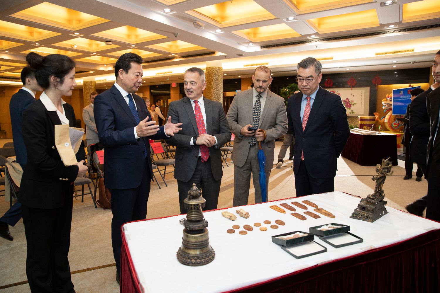 当地时间4月17日,中国文物返还移交仪式在纽约曼哈顿中国驻纽约总领馆举行。美国纽约曼哈顿区检察官办公室将缴获的38件中国流失文物移交中国政府。图为中国文化和旅游部副部长、国家文物局局长李群(左二)、美国纽约市曼哈顿区检察官办公室古物走私组负责人科洛内尔·马修·博格达诺斯(右三)、中国驻纽约总领事黄屏(右一)等查看返还文物。(图片来源:本文图片均据中新社)