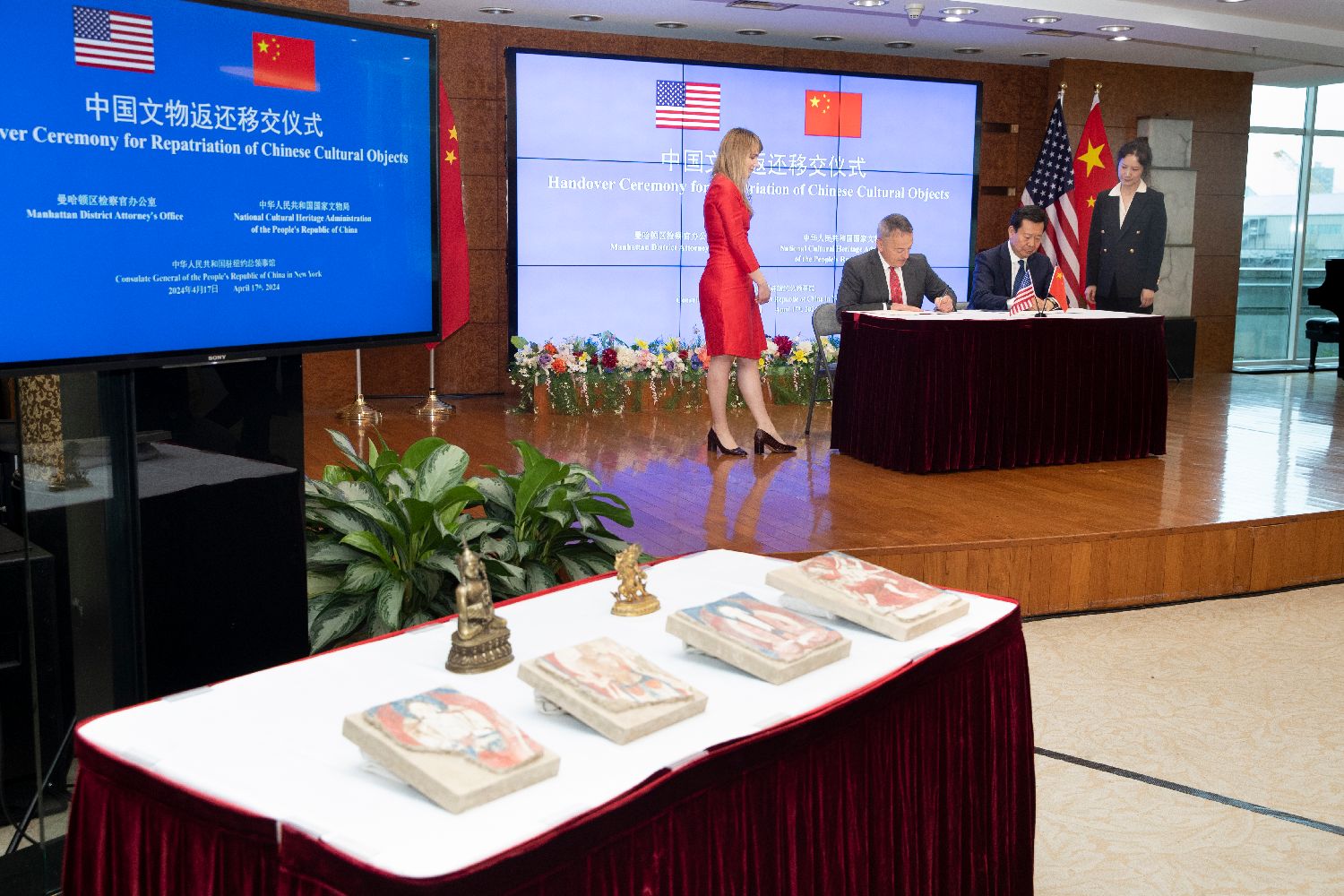 当地时间4月17日,中国文物返还移交仪式在纽约曼哈顿中国驻纽约总领馆举行,美国纽约曼哈顿区检察官办公室将缴获的38件中国流失文物移交中国政府。