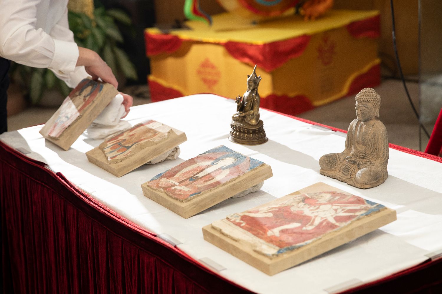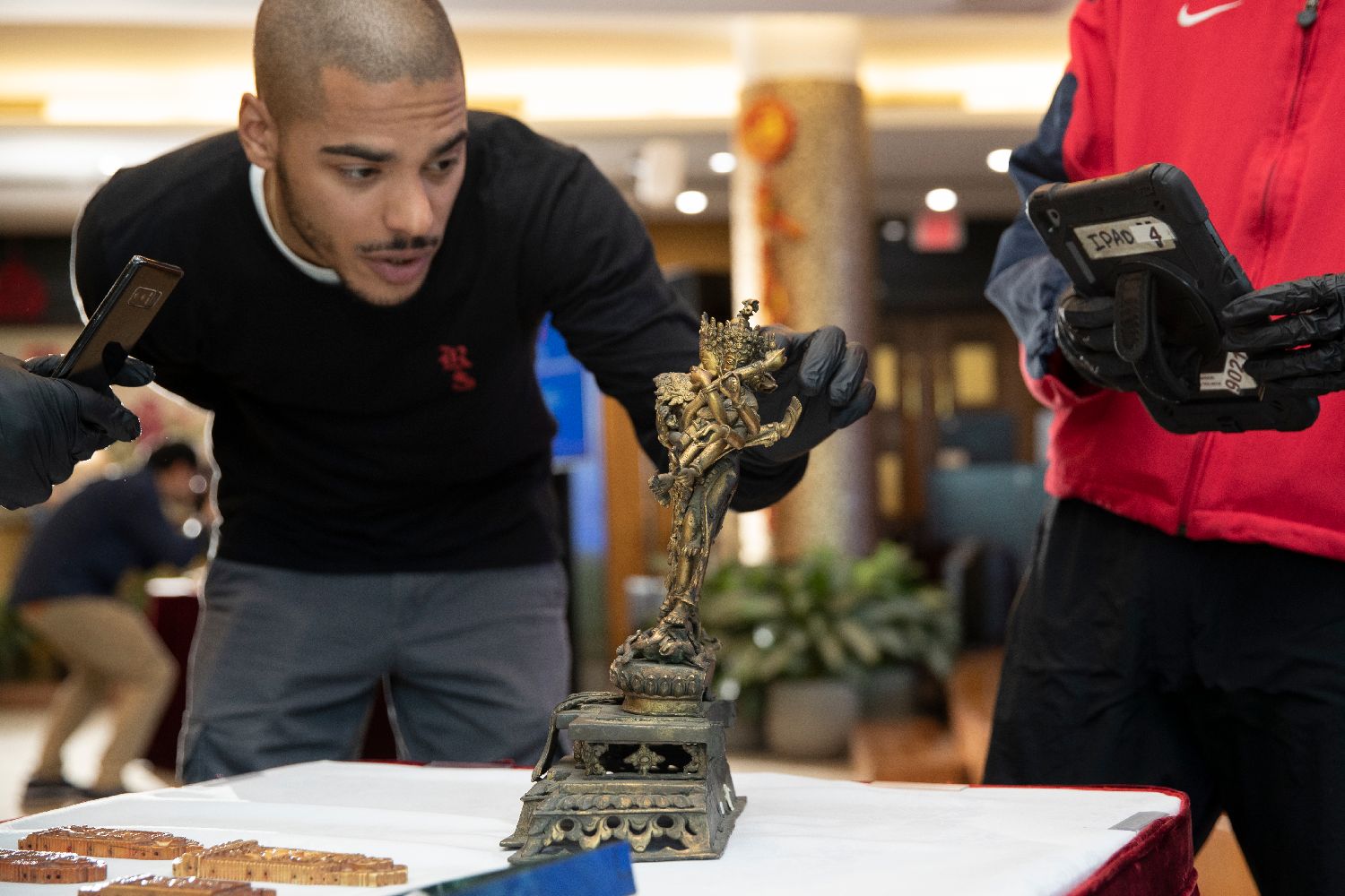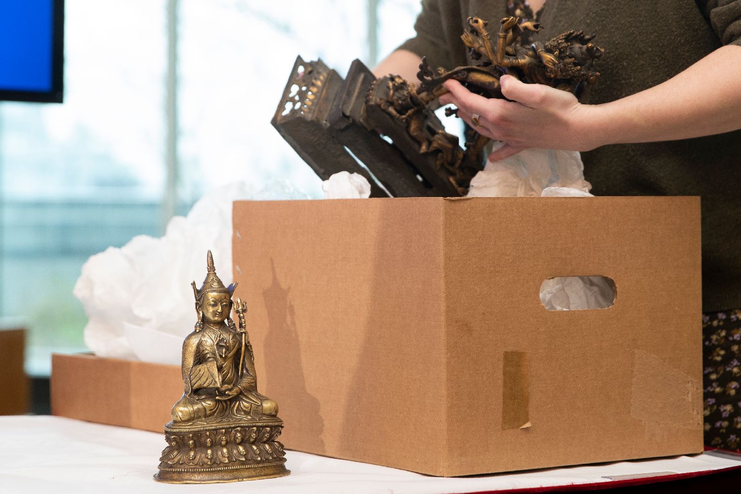 美方工作人员清点铜鎏金胜乐金刚像等文物。