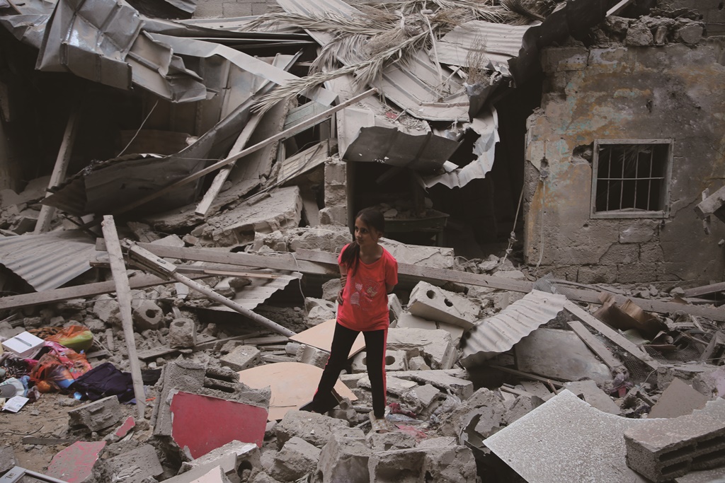 图为在加沙地带南部城市拉法,一名女孩站在以军空袭后的废墟上。(图片来源:新华社)