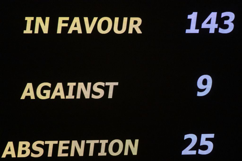中国央视新闻报道,在当天的表决中,中国、法国、俄罗斯等143国投了赞成票,美国、以色列等9国投了反对票,英国、德国、乌克兰等25国弃权。决议获得通过。