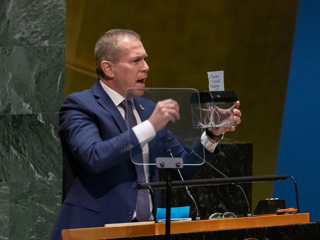 联大通过涉巴勒斯坦入联决议后,以色列常驻联合国代表埃尔丹表示,“你们在欢迎一个恐怖国家加入联合国。”埃尔丹指出,联合国正在姑息“凶残的独裁者”。随后,大会发生戏剧性一幕:埃尔丹举起便携式电动碎纸机,并现场粉碎了《联合国宪章》小册子的封面。他指出,是在场的联合国代表们“正在威胁《联合国宪章》”。