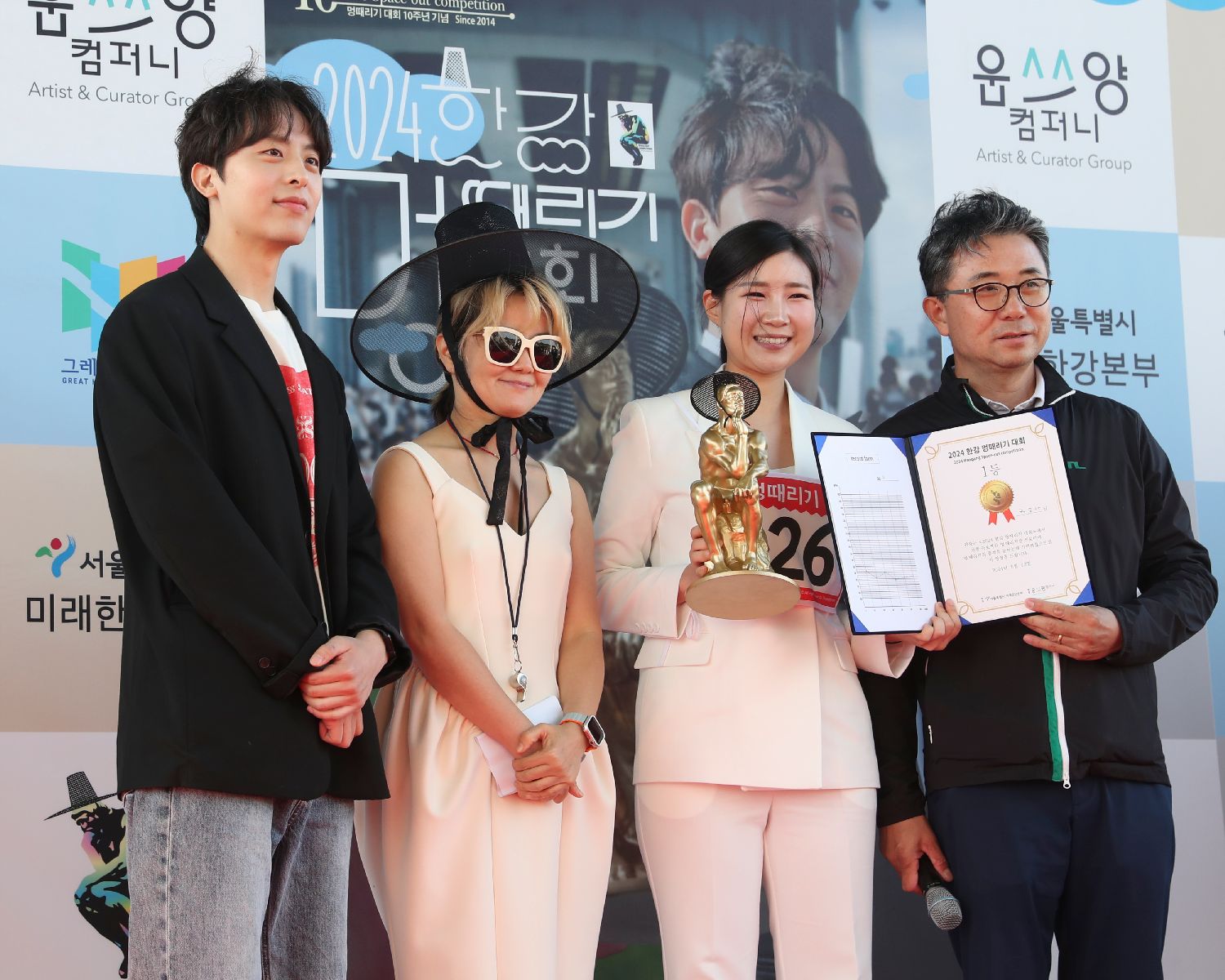 5月12日,在韩国首尔,“汉江发呆大赛”冠军手捧小金人在赛后留影。