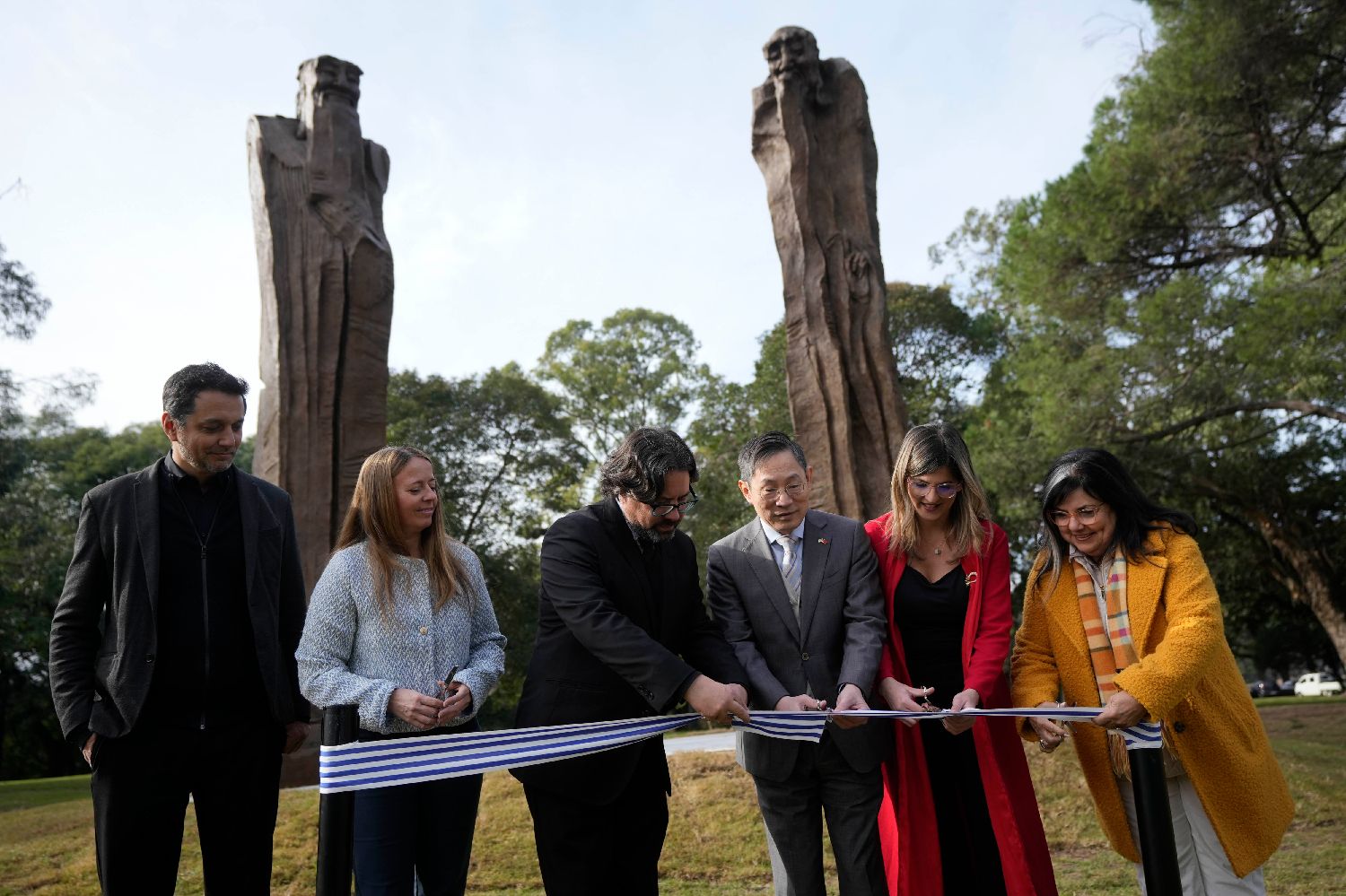 5月29日,嘉宾在乌拉圭首都蒙得维的亚市中心的巴特列公园为雕塑作品《问道》剪彩。(图片来源:本文图片均据新华社)
