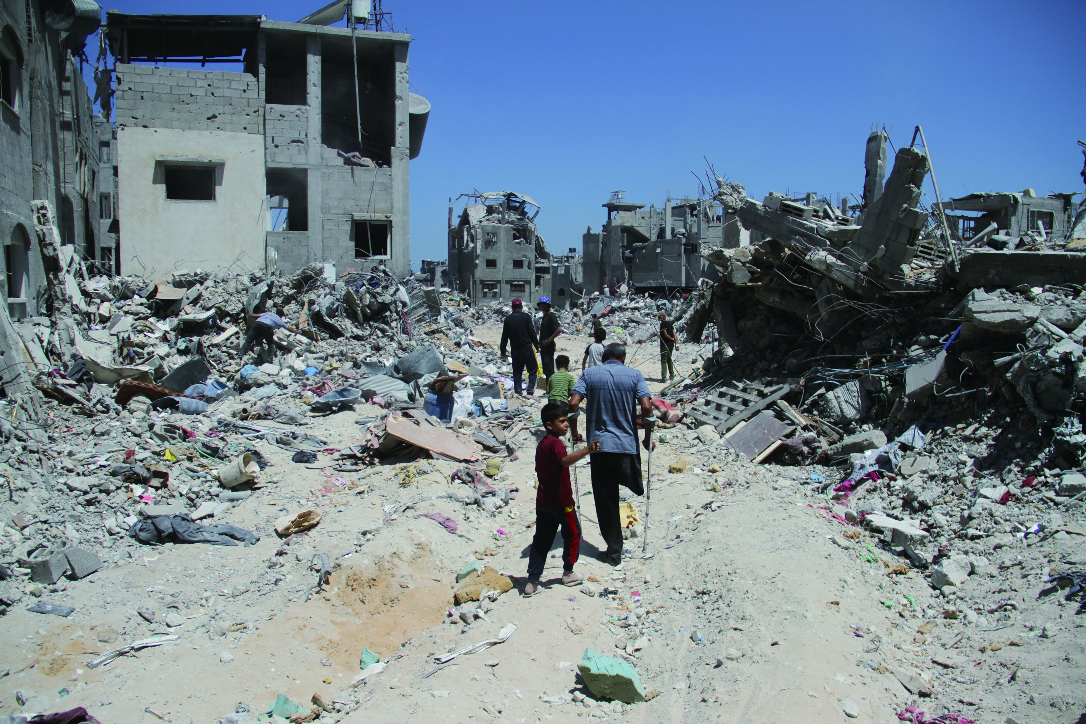 5月31日,在加沙地带北部杰巴利耶难民营,人们走过废墟。(图片来源:新华社)