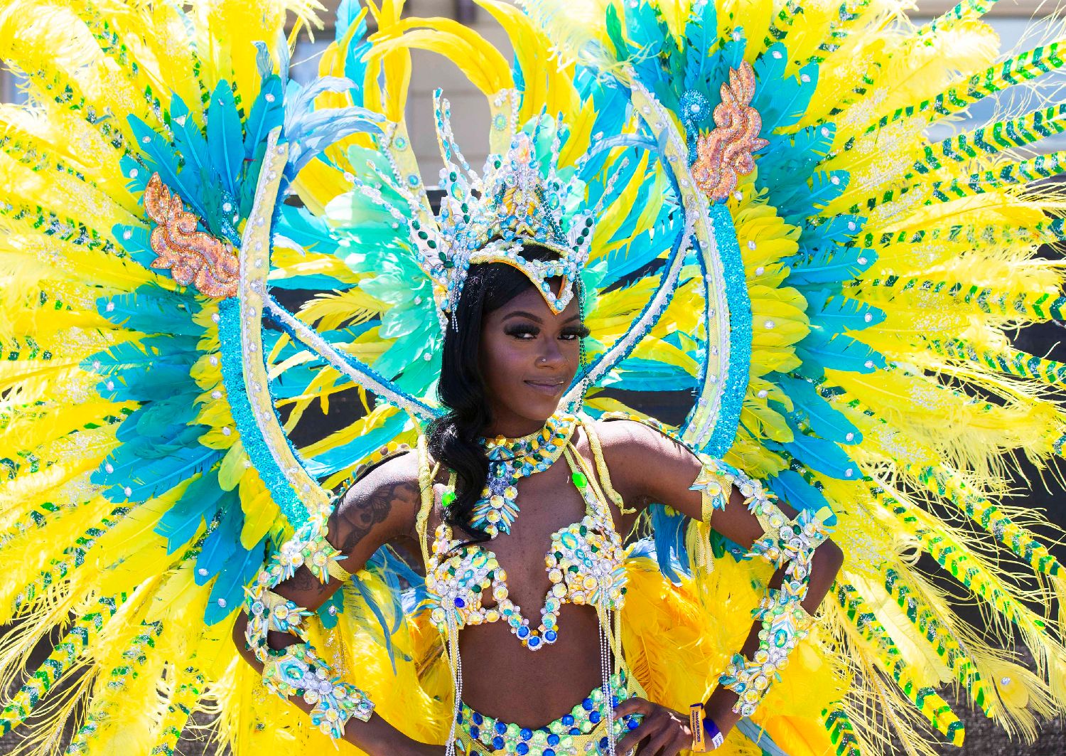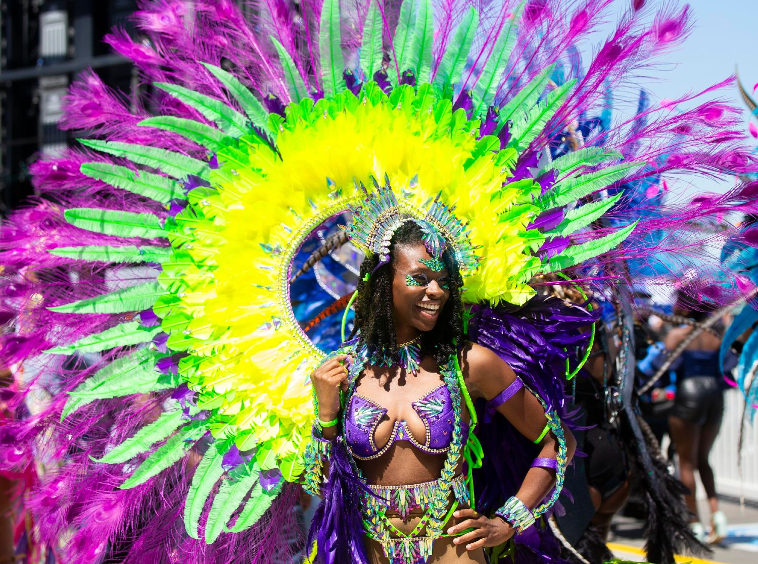 6月15日,在加拿大多伦多的加勒比狂欢节开幕式上,一名盛装的狂欢者进行展示。