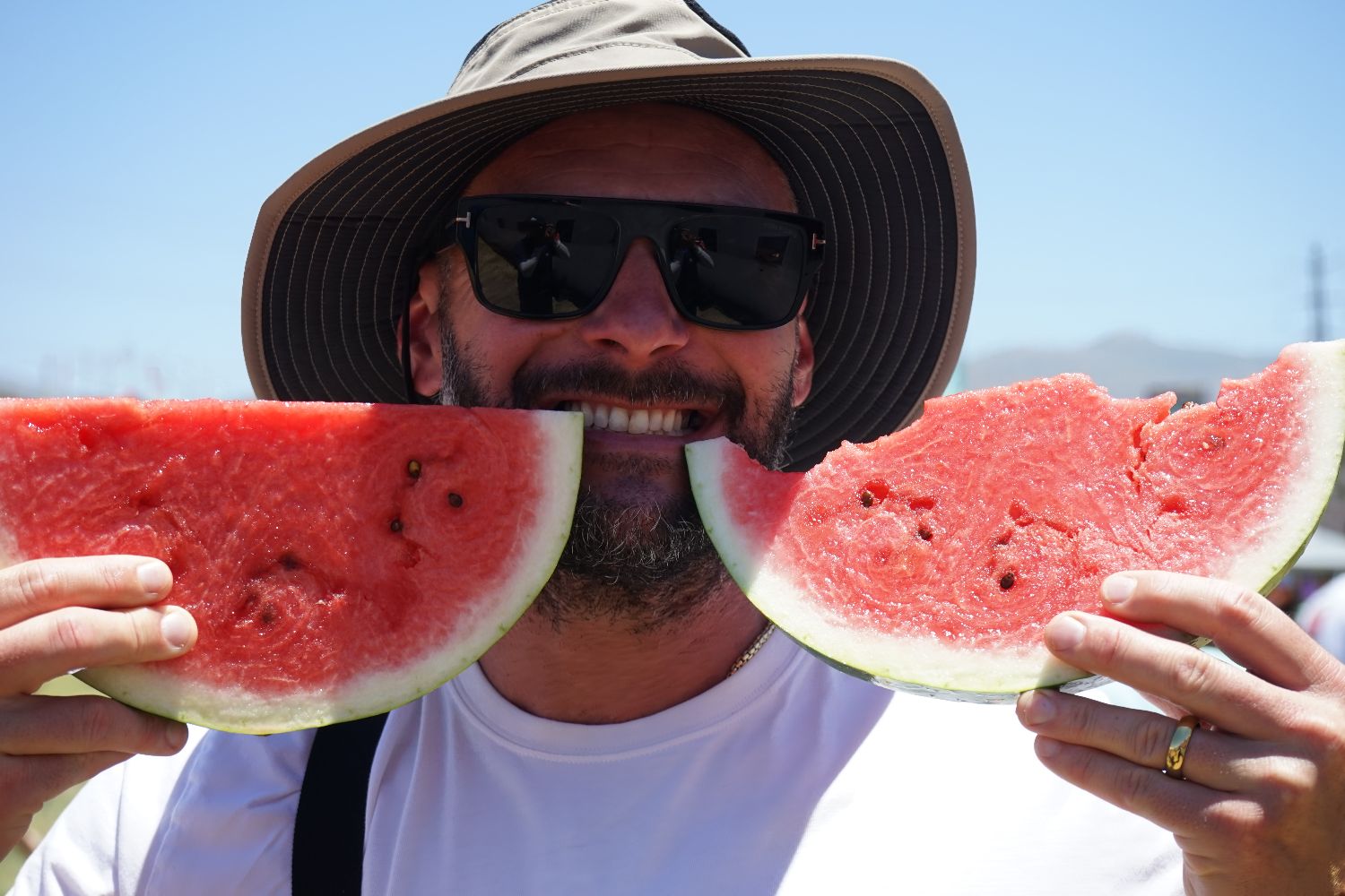 6月22日,一名男子在美国加利福尼亚州洛杉矶举行的加州西瓜节上留影。