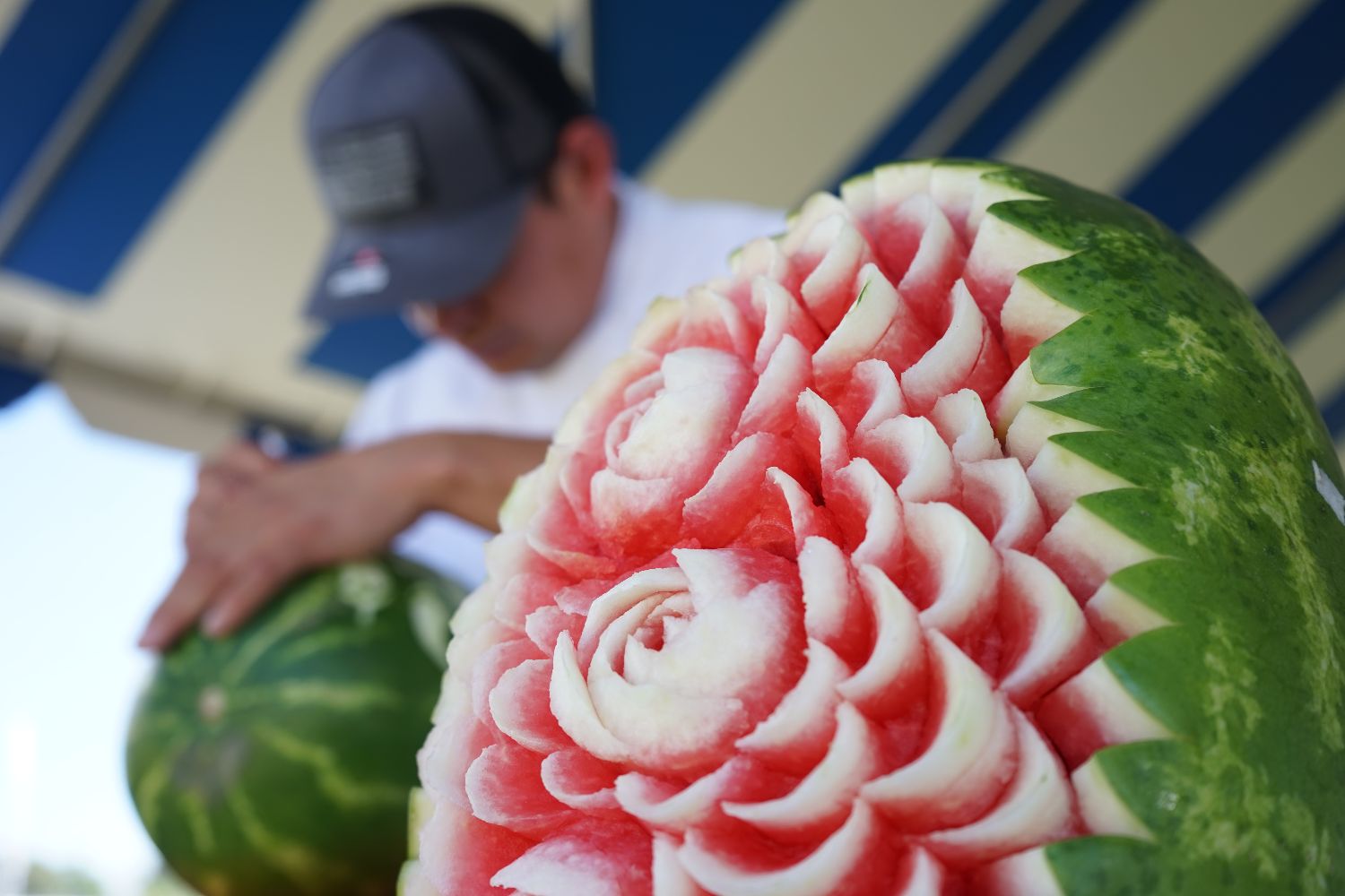 6月22日,一名男子在美国加利福尼亚州洛杉矶举行的加州西瓜节上雕刻西瓜。