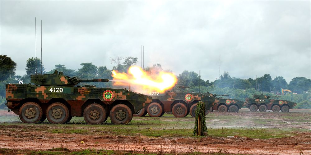 图为中方参演部队利用步战车进行实弹射击。(图片来源:中新社)