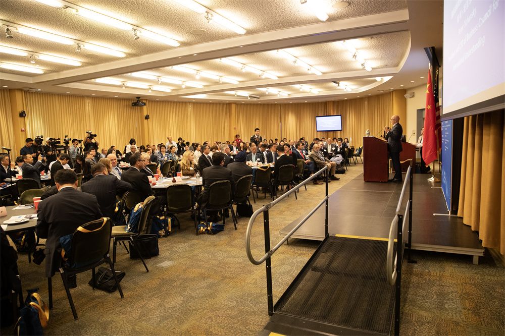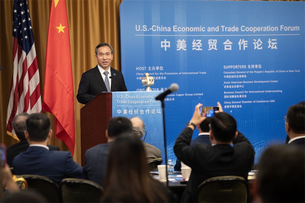 中国—美国经贸合作论坛29日在美国纽约举行。中国贸促会会长任鸿斌、中国驻纽约总领事黄屏、国际谅解商务委员会总裁兼首席执行官彼得·提察恩斯基、亚美商业发展中心总裁王章华、美国国际工商理事会首席执行官戴克兰·达利、美国中国总商会会长胡威等出席并致辞,300余位中美企业及商协会代表出席。