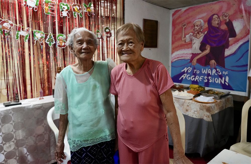资料图为2023年12月22日,菲律宾“慰安妇”幸存者埃斯特莉塔(右)和娜西萨在马尼拉参加一场聚会。